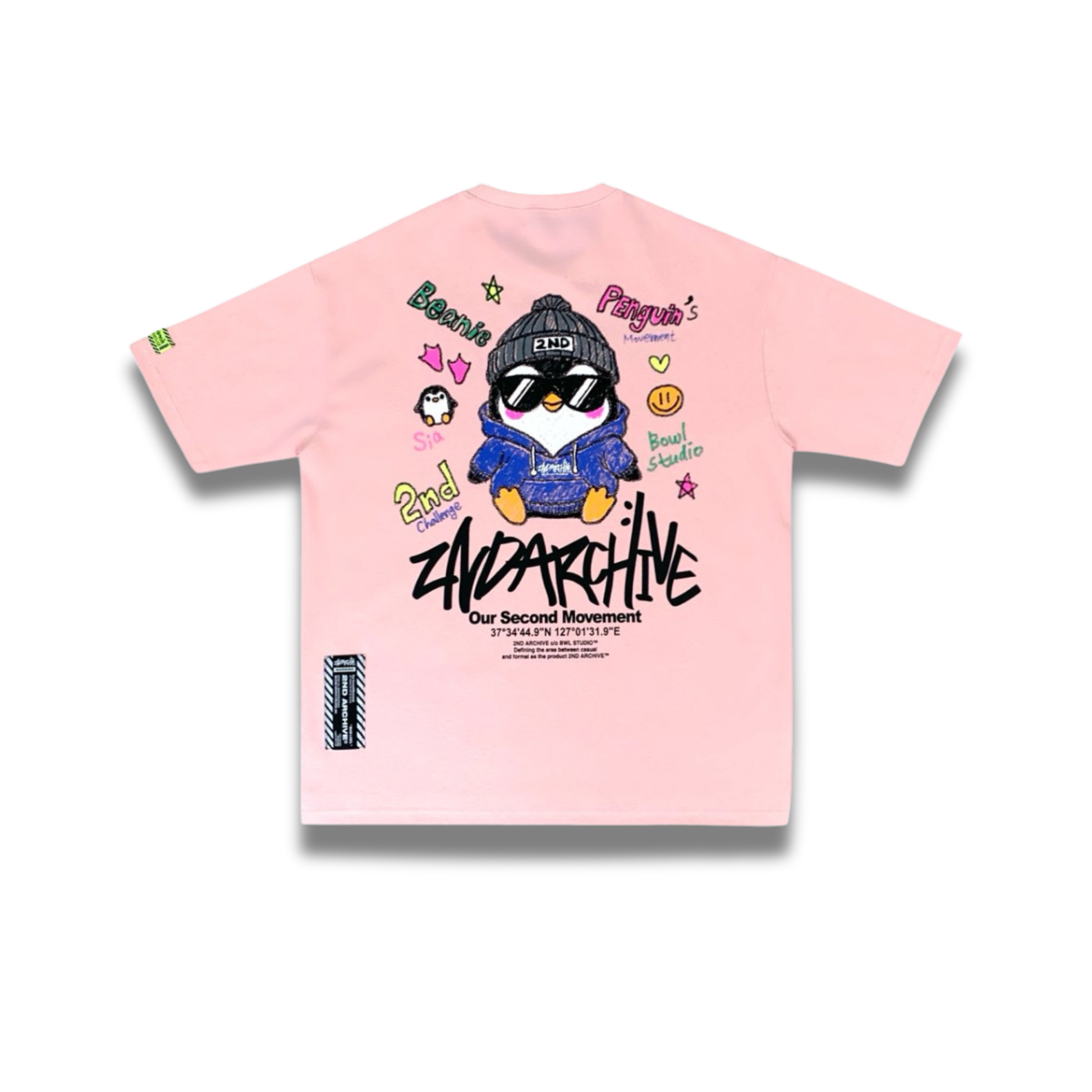 カジュアルとフォーマルの境界線を再定義する、2ND ARCHIVE c/o BWL STUDIO™ の新章を告げる一枚。ラベンダーパープルのボディに、ビーニーとサングラスをまとったキュートなペンギンマスコットと、カラフルなドゥードゥルグラフィックが全面に広がります。「Our Second Movement」——これは単なるTシャツではなく、ムーブメントの宣言です。