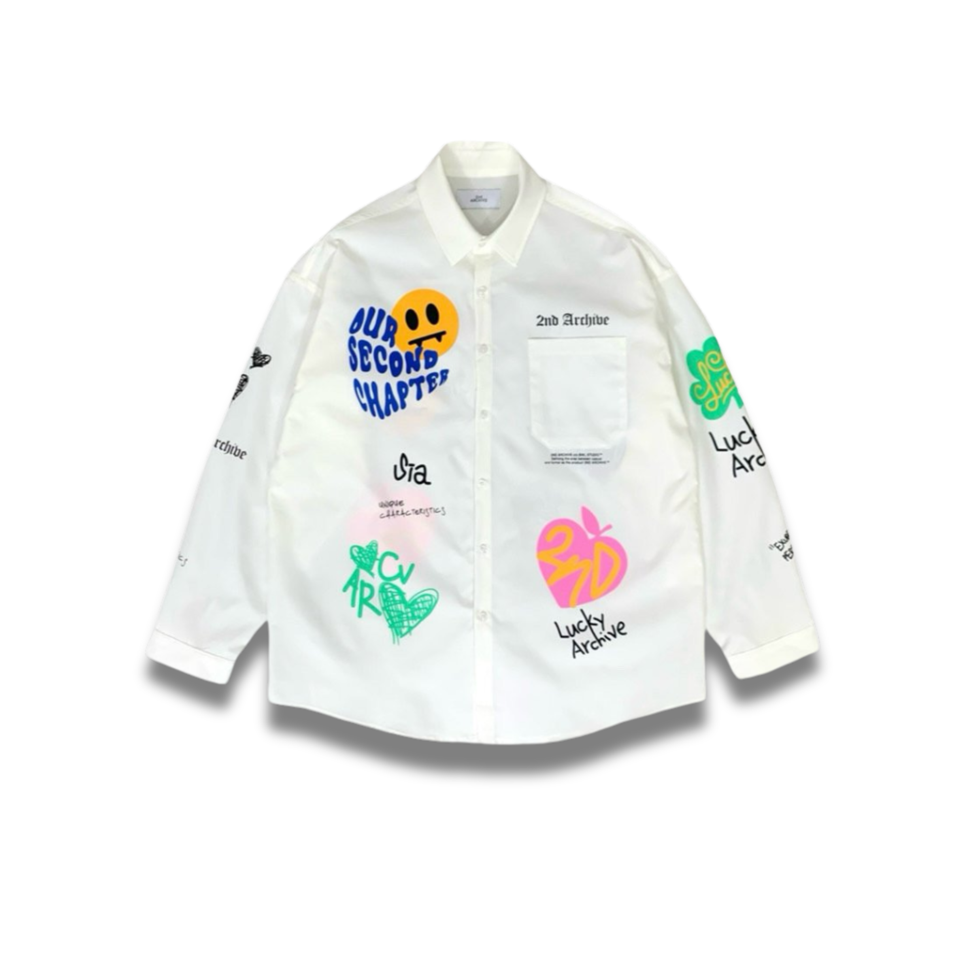 明るくてカラフル、それでいてプレミアム——2ND ARCHIVE c/o BWL STUDIO™Lucky Archive® のコラボレーション作。バナナフェイススマイリー、ピンクのハート形ピーチ、グリーンクローバー、グラフィティハート——ポップアートのエネルギーが白いキャンバス一面に広がります。「OUR SECOND CHAPTER」——新しいチャプターの始まりを着る一枚。