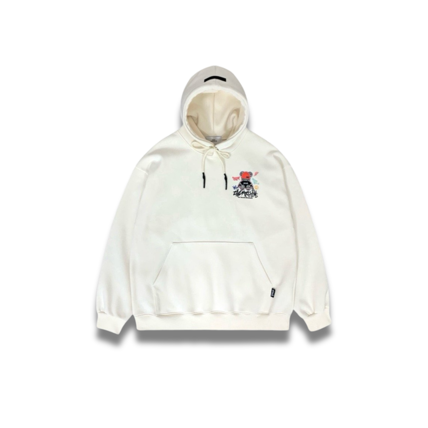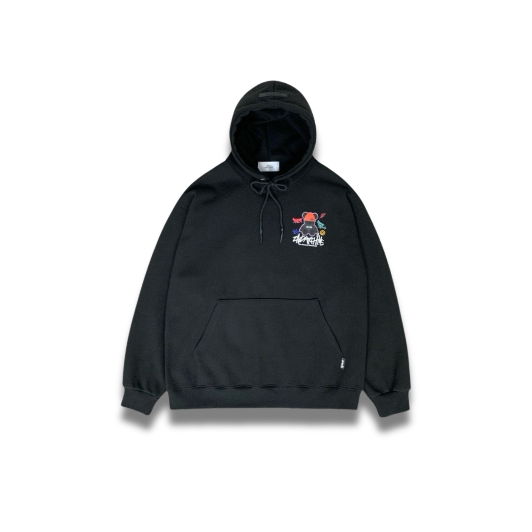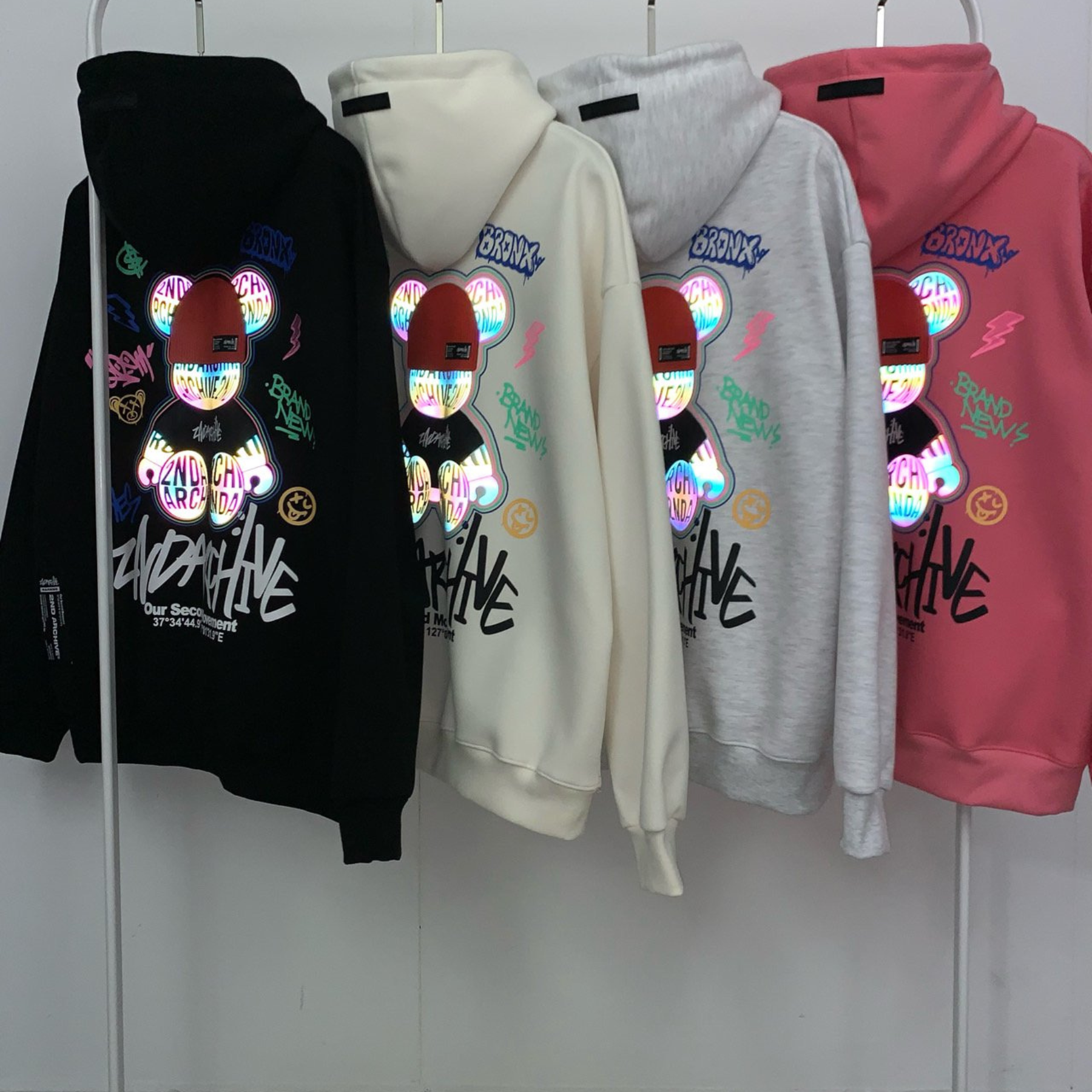背面に大胆に施されたリフレクティブ(反射)仕様のベアグラフィックが、光に当たるときらめき、夜間のコーデにもアクセントをプラス。フロントにはミニサイズのワンポイントロゴが刺繍され、フードにはさりげなく反映されたストリートなエッセンスが◎。