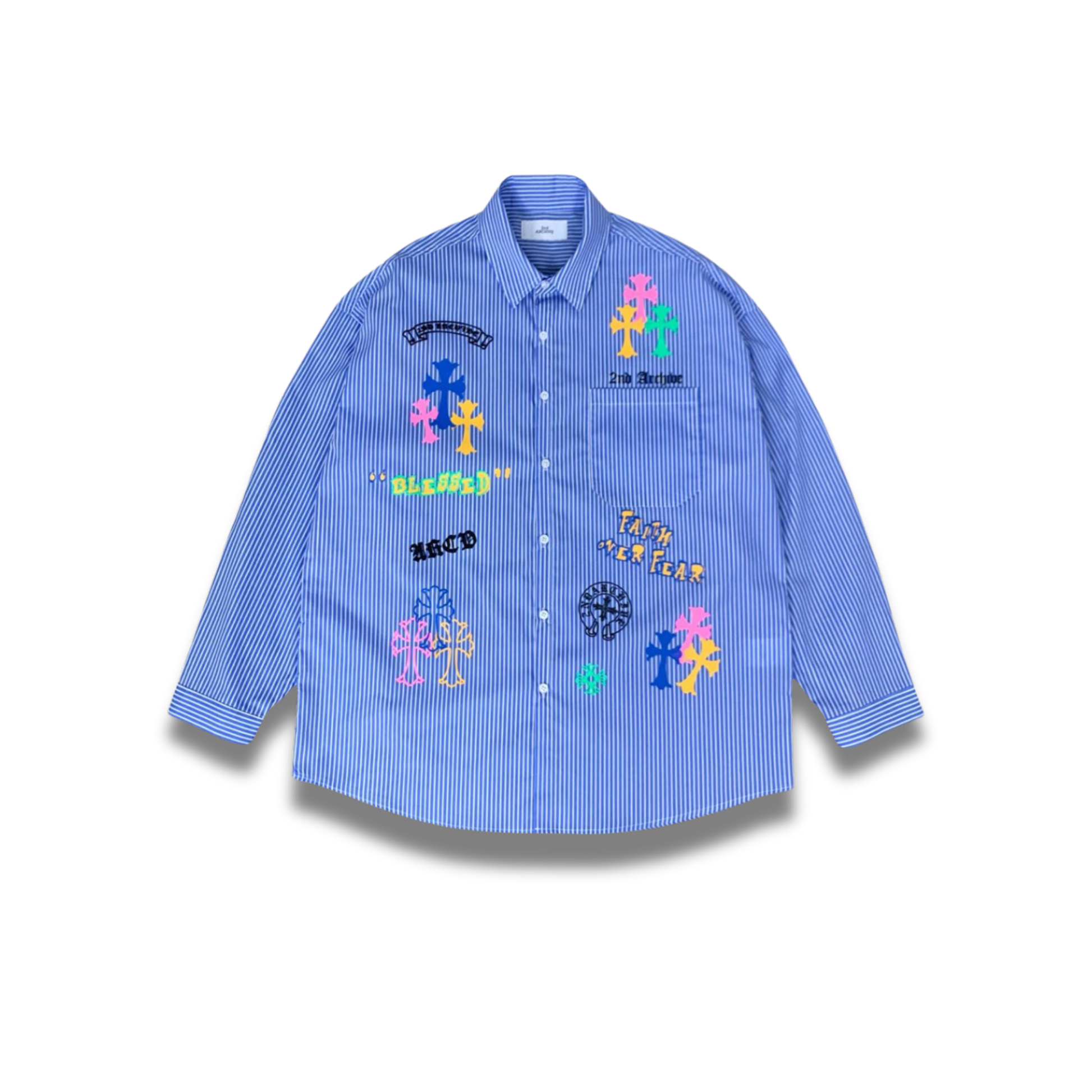 信仰とストリートの境界線を行く、2ND ARCHIVE c/o BWL STUDIO™ のアイコニックな一枚。ブルー×ホワイトのピンストライプに、ゴシック体「2nd Archive」レタリング、大型円形クロスメダリオン、ネオンカラーのクロスグラフィックが全面に散りばめられたアートピース。「FAITH OVER FEAR」「BLESSED」——着るだけでメッセージを発信する一枚。