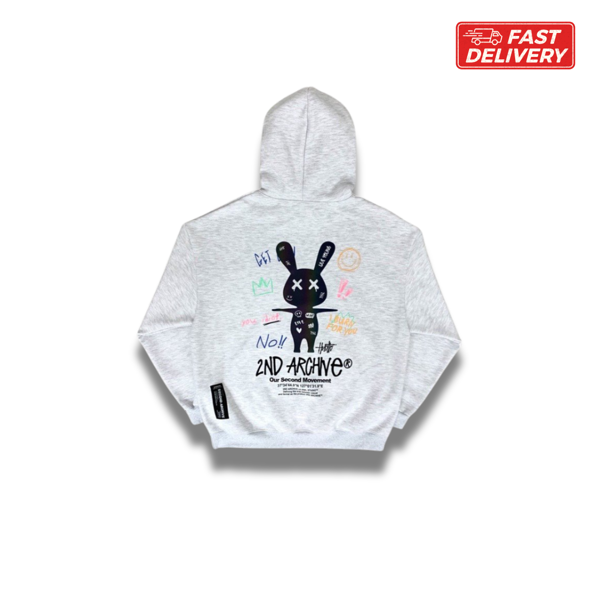 韓国発の人気ストリートブランド「2nd Archive」から、遊び心溢れる落書きバニーがデザインされたパーカーが登場。ネオンカラーを基調としたポップなデザインが特徴で、ストリートファッションに欠かせないアイテムです。