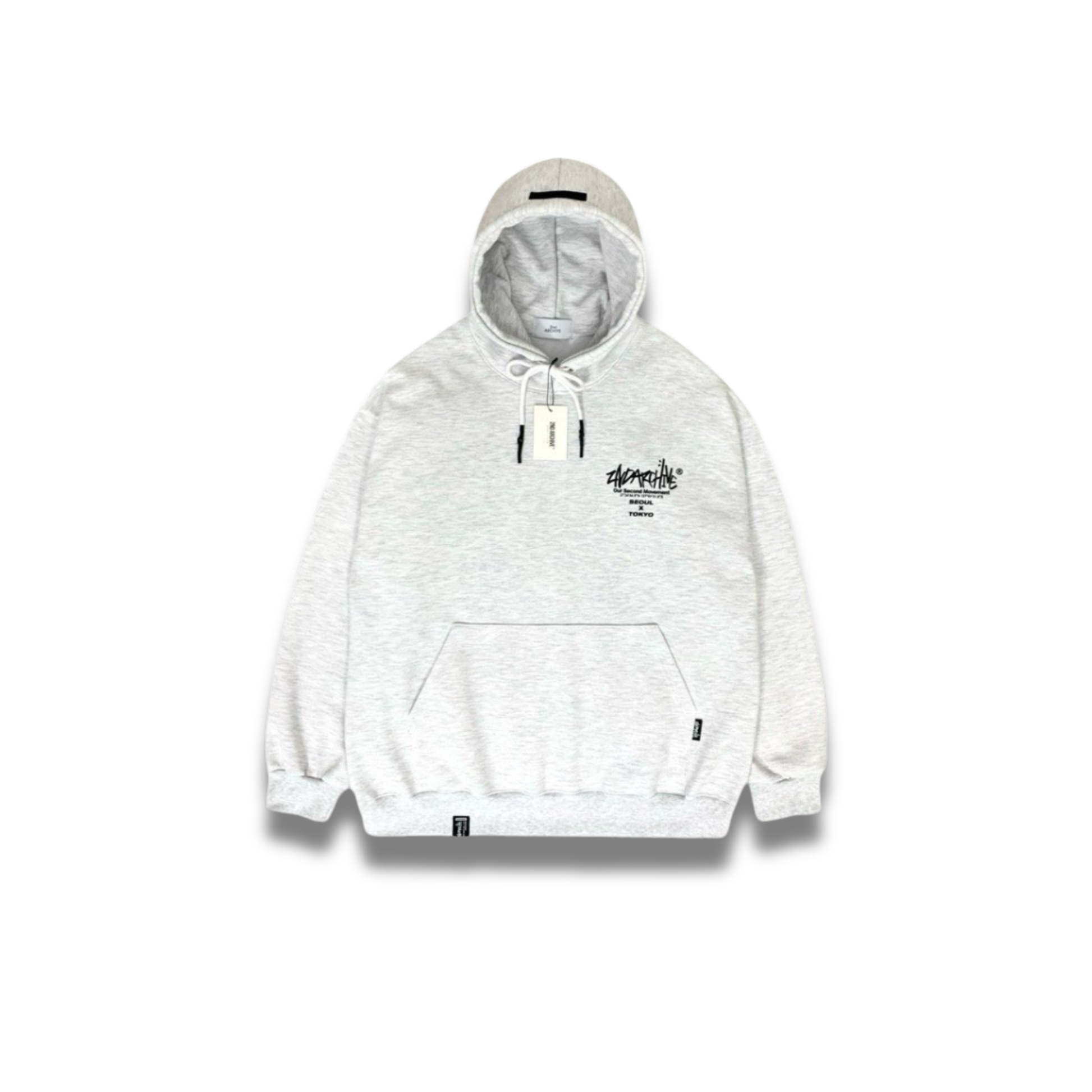 胸元にはホワイトのブランドロゴを配置。袖とフードには無地の切り替えを加え、派手すぎず程よくストリート感のあるルックスに。