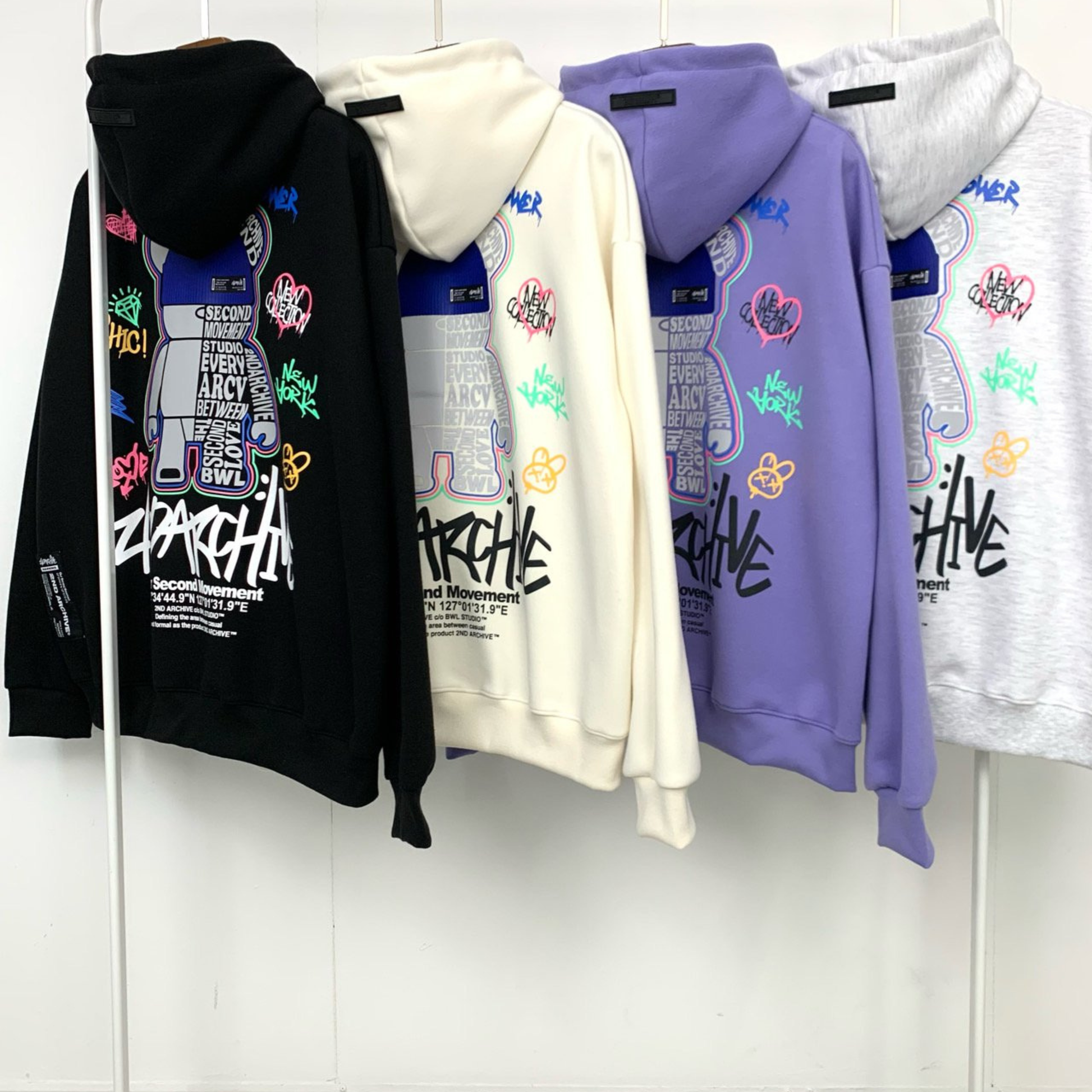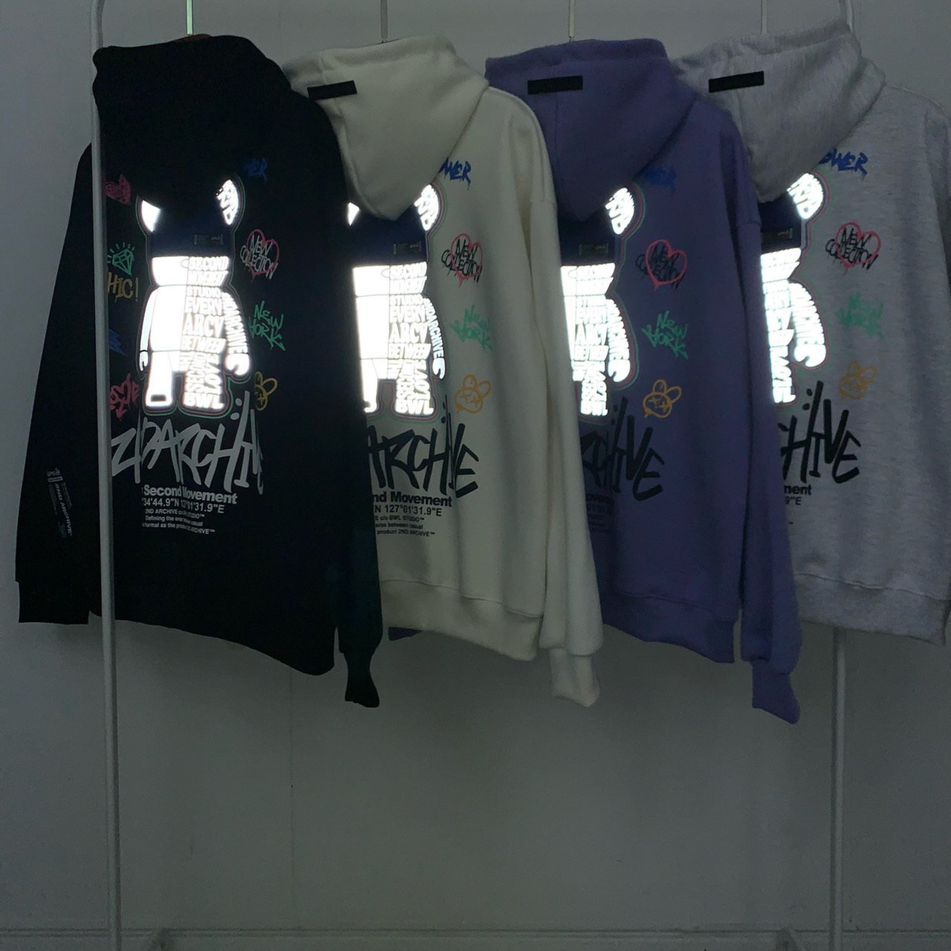 大胆なベアグラフィックが特徴的なこのパーカーは、昼夜問わずスタイルを主張します。リフレクティブ素材を使用したグラフィックは、夜間や暗い場所で光を反射し、安全性とファッション性を兼ね備えています。マッチングジョガーパンツと合わせれば、完璧なストリートウェアセットアップの完成です。